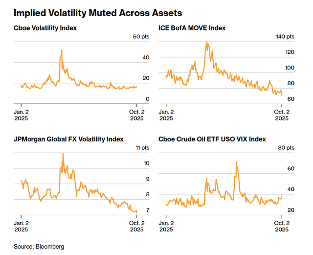 股市方面,9月期权交易量创下纪录,随着投资者开始为年底行情增加对冲操作,对市场波动的预期有所升温。但如果实际波动始终受限,交易员愿意为期权支付的溢价也会存在上限。