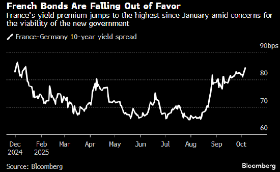 法国国债下跌,因投资者准备迎接更多的政治不确定性。10年期国债收益率一度上升9个基点至3.6%,从而使得法债收益率相对于德债收益率的溢价——也就是一项关键的财政风险衡量指标——超过89个基点,是自2024年底以来的最高水平。