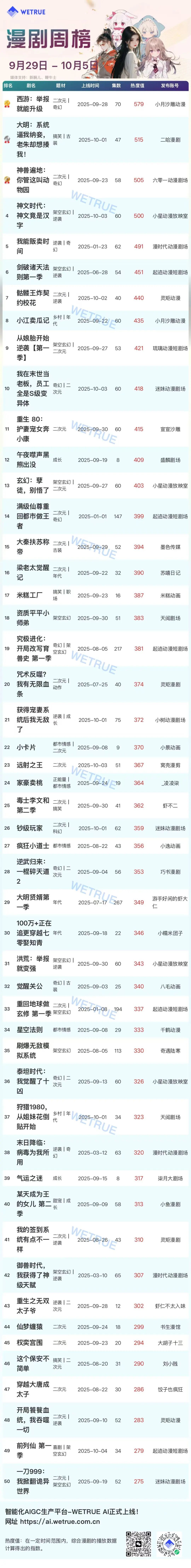 10月6日,新腕儿、鞭牛士联合WETRUE一点查剧共同推出10月第1周短剧漫剧周榜。