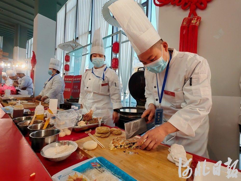 “肉饼争霸味动天下”第二届国际肉饼争霸赛决赛举行,厨师将新鲜出炉的肉饼切好装盘。(河北日报资料片)河北日报记者刘杰摄