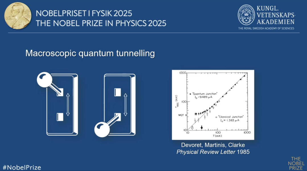 今年的诺贝尔物理学奖表彰了那些展现如何在宏观尺度上观察到量子隧穿效应的实验,这些实验涉及许多粒子。1984 年和 1985 年,John Clarke、Michel H. Devoret 和 John M. Martinis 在加州大学伯克利分校进行了一系列实验。