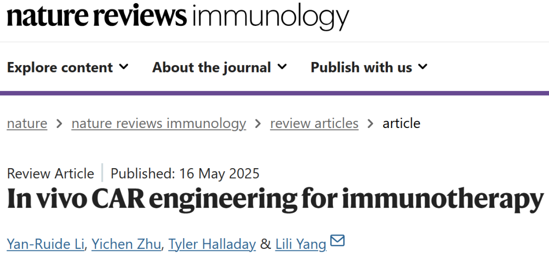Li, YR., Zhu, Y., Halladay, T. et al. In vivo CAR engineering for immunotherapy. Nat Rev Immunol (2025). https://doi.org/10.1038/s41577-025-01174-1.