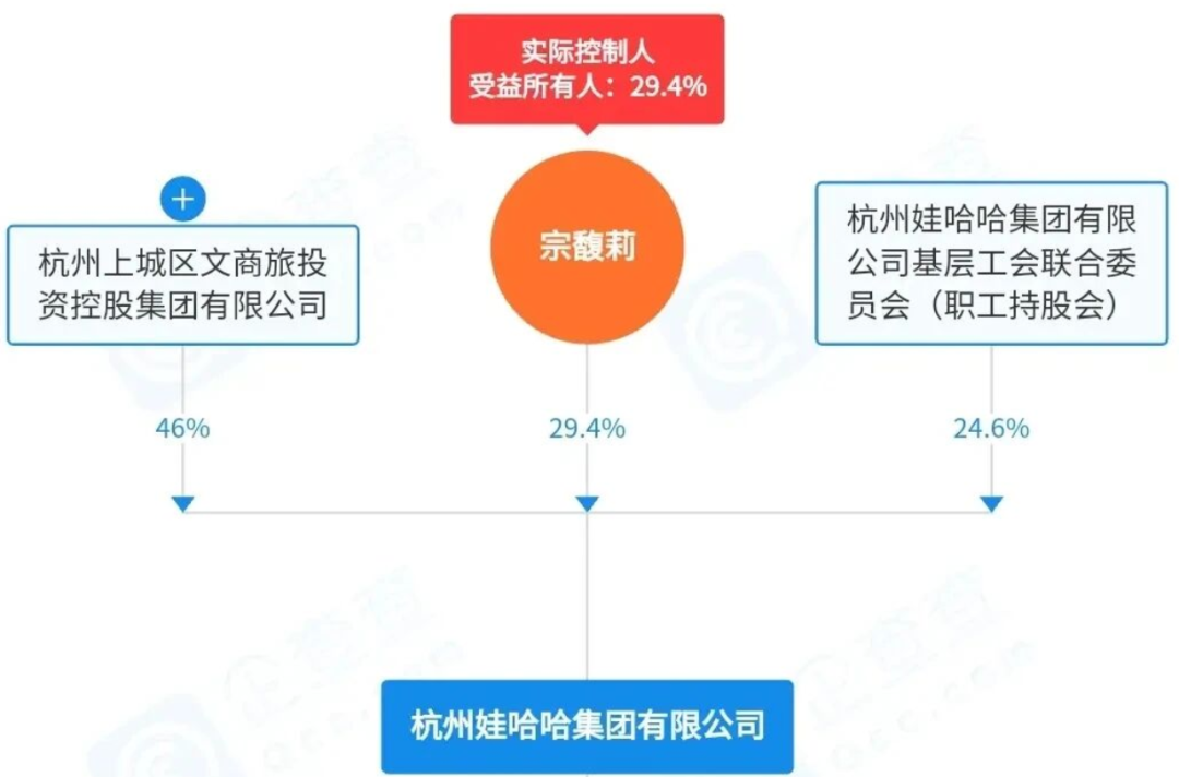 娃哈哈集团的第一大股东为杭州上城区国资委,持股 46%,宗馥莉继承 29.4% 的股份为第二大股东,职工持股会持股 24.6%。