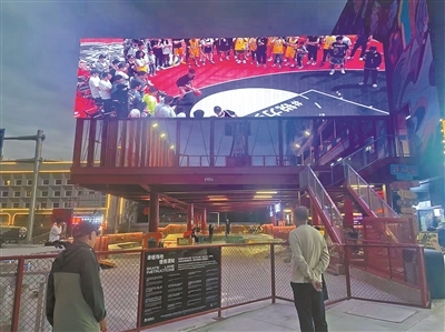 9月21日,北青报记者来到“THEBOX朝外”商场。远远望见“THEBOX朝外”深灰色的外立面上超大曲面LED屏幕光影闪烁,播放着时尚潮流的画面。门口聚集着三两成群的年轻人,身着个性服饰,手持咖啡,谈笑风生,满满的潮流气息扑面而来。户外滑板空间里,滑手们踩着滑板,做出各种高难度动作,滑板与地面摩擦发出清脆声响。楼上是北京首个空中光影篮球场,平时这里聚集了大量的篮球爱好者,几乎每天都有比赛。