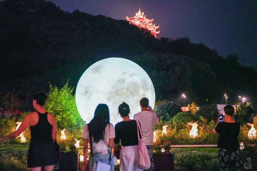 国庆长假期间,位于杭州吴山广场的吴山花海里打造的一处中秋主题灯饰,成为杭州的热门打卡点之一。一轮直径3米的“超级月亮”与一群萌趣“玉兔”出现在草坪上,以其白天的“月球形态”与夜晚的“皎皎满月”绚烂造型,吸引了许多市民游客前来,共赏这轮提前升起的“吴山明月”,沉浸在浓郁的双节氛围之中。