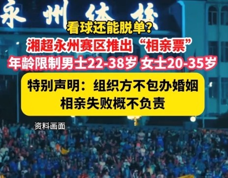 10月9日,永州市足协在即将开赛的“湘超联赛”第5轮永州队vs邵阳队的比赛中推出“相亲票”。九派新闻报道,永州市文旅局工作人员表示:“‘相亲票’报名量挺大,也专门为相亲对赛场座椅做了设计。”