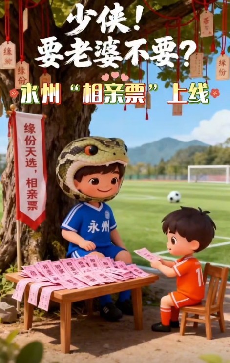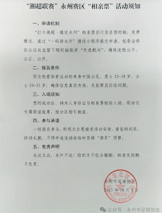 九派新闻注意到,永州市足协发布的“湘超联赛”永州赛区“相亲票”活动须知显示——相亲票实行实名预约制,免费送,通过“一码游永州”微信小程序提交申请。组委会将在公证处监督下随机抽取并“天选配对”,确保流程公平、公正、公开。活动须知还注明,一经报名参与,即视为自愿接受活动安排,请坚持到底、保持礼貌,不得中途退场或临时安排“演员”顶替。