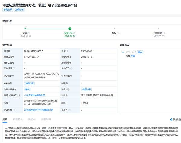 【CNMO科技消息】近日,小米汽车科技有限公司公布了一项新专利,名为“驾驶场景生成方法、装置、电子设备和程序产品”,该专利可提升辅助驾驶安全性。