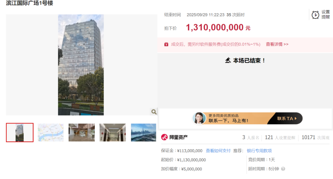 近日,阿里资产交易显示,上海滨江国际广场1号楼以13.1亿元售出。此次竞拍起拍价11.3亿元,3人报名,经过37轮出价,最终由P1592买家溢价15.9%拿下。
