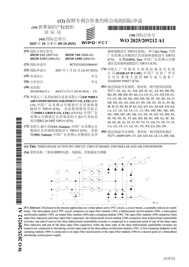 证券之星消息,根据企查查数据显示美的集团(000333)公布了一项国际专利申请,专利名为“三相有源PFC电路、线路板、控制器及空调器”,专利申请号为PCT/CN2025/084093,国际公布日为2025年10月9日。