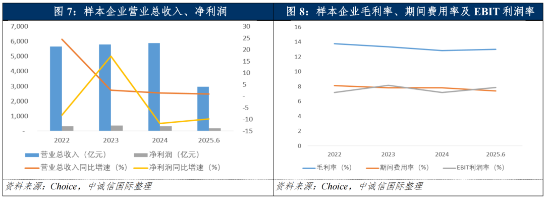 营业收入方面,2025年上半年,在销售气量及接驳业务量下降的多重影响下,17家样本企业中有10家营业总收入同比下滑,但受益于昆仑能源、深圳燃气及佛燃能源上半年营业总收入实现较好增长,样本企业合计营业总收入同比增长0.97%。其中昆仑能源主要系城燃项目扩张叠加新拓展工业用户带动销气量提升所致;深圳燃气及佛燃能源主要系粤港澳大湾区工业用气需求增长,叠加能源相关业务拉动。净利润方面,17家样本企业中12家净利润同比均有所下滑,其中昆仑能源增收不增利,其净利润下滑主要系受国际原油价格下跌影响,昆仑能源勘探生产业务大幅亏损所致;华润燃气净利润下滑幅度较大主要系核心业务需求萎缩叠加投资收益下滑所致。此外,大众公用净利润逆行业增长主要系投资收益大幅回升。2025年上半年样本企业合计净利润同比下降9.78%。2025年上半年,城燃企业购销价差维持稳定,但受需求疲软影响,燃气销售及接驳业务量下滑对城燃企业利润持续产生负面影响,上述影响下,样本企业毛利率均值微降。2025年上半年,样本企业期间费用率均值同比变动不大,受利润总额及营业总收入不同程度下降影响,样本企业EBIT利润率均值随之小幅增长。