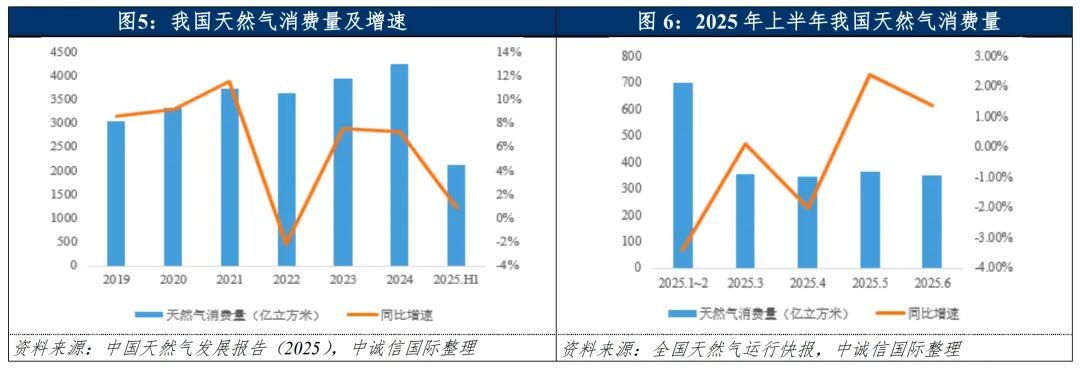 从需求端来看,2025年上半年,全国天然气表观消费量2,119亿立方米,同比微降0.9%。主要受天气及工业用气需求下降影响,1~2月以及4月,天然气消费量均呈负增长,5~6月消费量同比有所增长。分季度看,一季度为传统供暖季,但2025年冬季气温较正常年份偏高,抑制当期城市燃气需求;二季度需求回暖不及预期,其中4月我国制造业PMI指标回落,陶瓷、玻璃等生产企业减产导致工业用气需求下降;5~6月份,工业、LNG重卡用气需求提振带动消费量实现增长。据国家能源局预测,预计2025年我国天然气消费量4,300亿~4,500亿立方米,同比增长2%~3%。