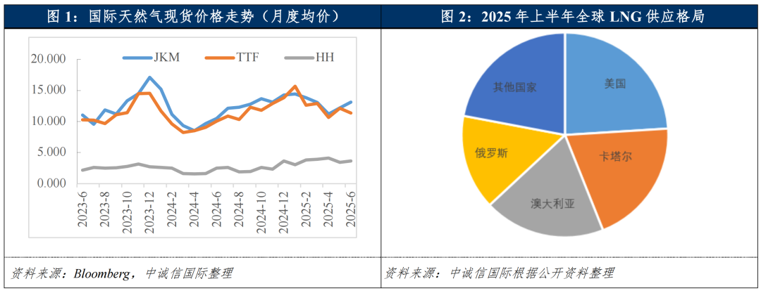 2025年上半年,国际主要市场天然气价格呈波动增长态势,2025年上半年受全球气候波动,叠加地缘政治等因素综合影响,国际天然气价格呈波动增长态势,但价格仍处于相对低位。分季度看,一季度,欧洲及北美等地区供暖需求集中释放,叠加地缘政治冲突导致过境管线停运,国际天然气价格有所提高,但随着新增LNG产能快速释放,国际天然气价格冲高后呈回落态势。二季度,国际天然气市场受到不断出现的地缘政治冲突事件的影响,价格同比小幅增长。中诚信国际预计2025年下半年,全球天然气市场供需将继续保持弱平衡态势,国际天然气价格预期维持在相对低位,但地缘政治紧张、关税政策、极端气候等不确定性因素犹存。