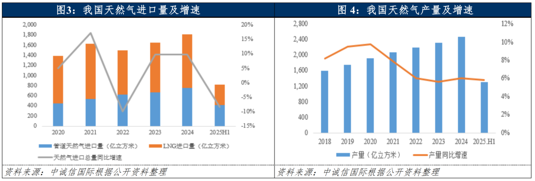 我国天然气对外依存度高,天然气进口量与进口结构受国际市场环境变化影响较大。2025年上半年,我国天然气对外依存度约39%,当期进口量824亿立方米,同比下降8.3%,其中受中俄东线达产带动管道气进口量同比增长10.5%至416亿立方米;LNG进口408亿立方米,同比大幅下降,主要进口来源包括土库曼斯坦、澳大利亚、俄罗斯、卡塔尔等国。国产气源方面,我国天然气探明率低,但近年来勘探开发持续发力,叠加海气项目建成投产将进一步提高我国天然气产能。2025年上半年,我国天然气产量保持稳定增长态势,规上工业天然气产量1,308亿立方米,同比增长6.0%,其中煤层气、页岩气等非常规气源约占四成。此外,我国首个自营超深水大气田“深海一号”二期项目全面投产,“深海一号”大气田最高日产能达1,500万立方米,成为国内迄今为止产量最大的海上气田,标志着我国迈出了以深水气田群建设实现深海油气规模化开发的关键一步。据国家能源局预测,2025年我国天然气产量预计增产超过百亿立方米。稳步增产的国产气源发挥着“压舱石”作用,但现阶段国内产量仍明显低于消费量,需进口天然气弥补供需缺口。