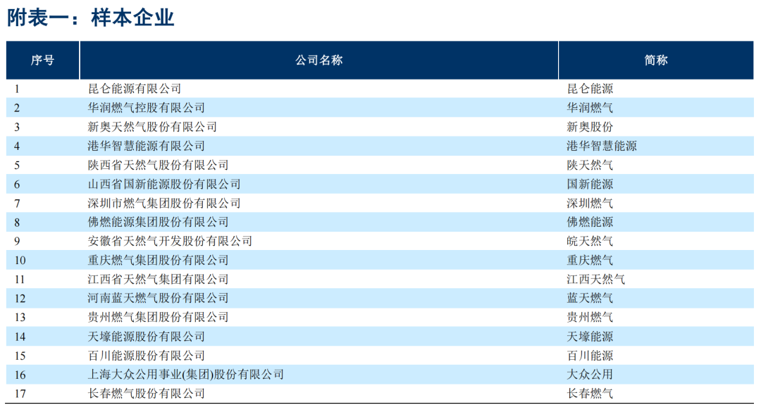 燃气行业上游仍集中在“三桶油”,均为巨型企业,与中下游燃气运营企业不具有可比性,本文主要选取下游燃气运营企业。考虑数据的可得性与可比性,本文选取的17家燃气运营企业(详见附件一)均为发债企业或上市企业。