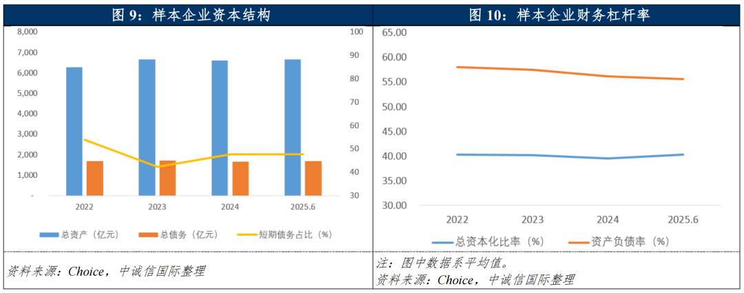 资本结构方面,2025年6月末,样本企业整体资产、债务规模较年初变化不大,合计总资产较年初增长0.68%,合计总债务规模较年初增长1.48%。其中受业务拓展、投资和短期资金需求影响,深圳燃气、港华智慧能源和佛燃能源总债务规模增长较多。同期末,总资本化比率均值为40.34%,较年初上升0.83个百分点;资产负债率均值为55.66%,较年初下降0.55个百分点。其中国新能源由于天然气管网投资规模较大,杠杆水平较高,总资本化比率超过60%;蓝天燃气、重庆燃气因总债务规模低、昆仑能源、华润燃气因资本雄厚,杠杆水平较低,总资本化比率在30%以下;多数样本企业总资本化比率集中在30~50%之间,行业整体杠杆水平保持稳健。债务期限结构方面,样本企业短期债务占比均值为47.80%,较年初上升0.04个百分点,短期债务占比偏高。