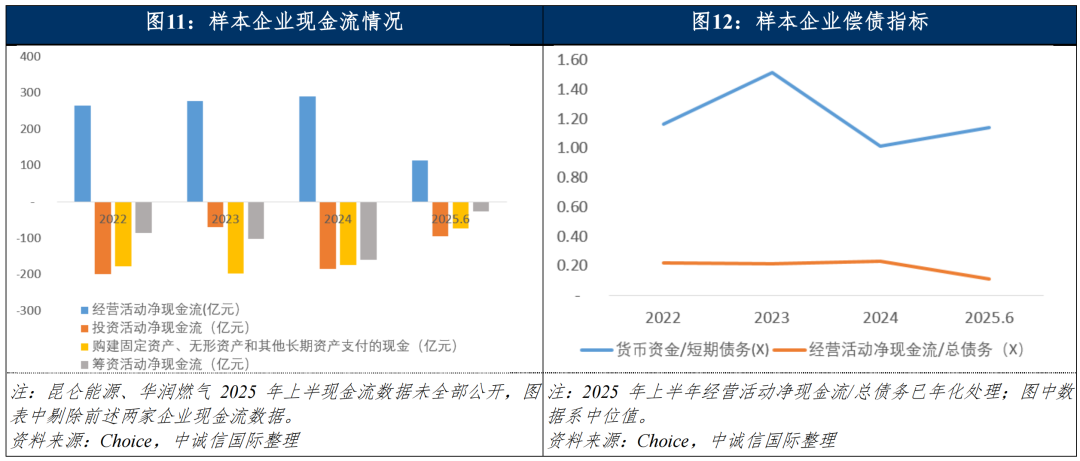 现金流方面,2025年上半年,样本企业仍保持着较强的经营获现能力,收现比均值为1.02,样本企业合计经营活动净现金流同比亦有所增长。资本支出方面,近年来在市场剧烈波动背景下,多数城燃企业投资节奏有所放缓,2025年上半年样本企业合计投资活动现金流同比下降1.04%,其中购建固定资产、无形资产和其他长期资产支付的现金同比下降3.35%,主要系天然气管网、储气设施、综合能源项目投资,且投资主要集中在新奥股份、港华智慧能源、深圳燃气、陕天然气等大型燃气企业。筹资活动方面,主要受新奥股份、国新能源加大债务偿还力度影响,2025年上半年,样本企业合计筹资活动现金流呈净流出状态。偿债指标方面,2025年6月末,样本企业合计货币资金保有量较年初小幅下降,同时短期债务有所增长,货币资金/短期债务中位数为0.65,较年初有所下降。经营活动净现金流/总债务中位数为0.10,偿债指标较年初有所弱化,但较强的经营获现能力对债务偿还形成支撑,同时,城市燃气企业融资渠道较为通畅,债务基本能够实现到期接续,行业整体偿债能力维持稳定。