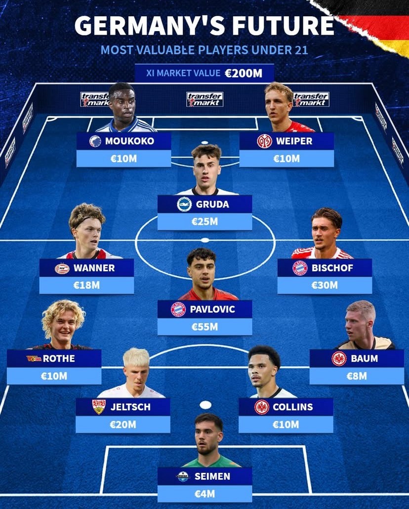 北京时间10月11日,德转列出了德国身价最高的U21球员阵容,亚历山大-帕夫洛维奇以5500万欧元的身价领衔,比朔夫、保罗-万纳、格鲁达以及穆科科在列。