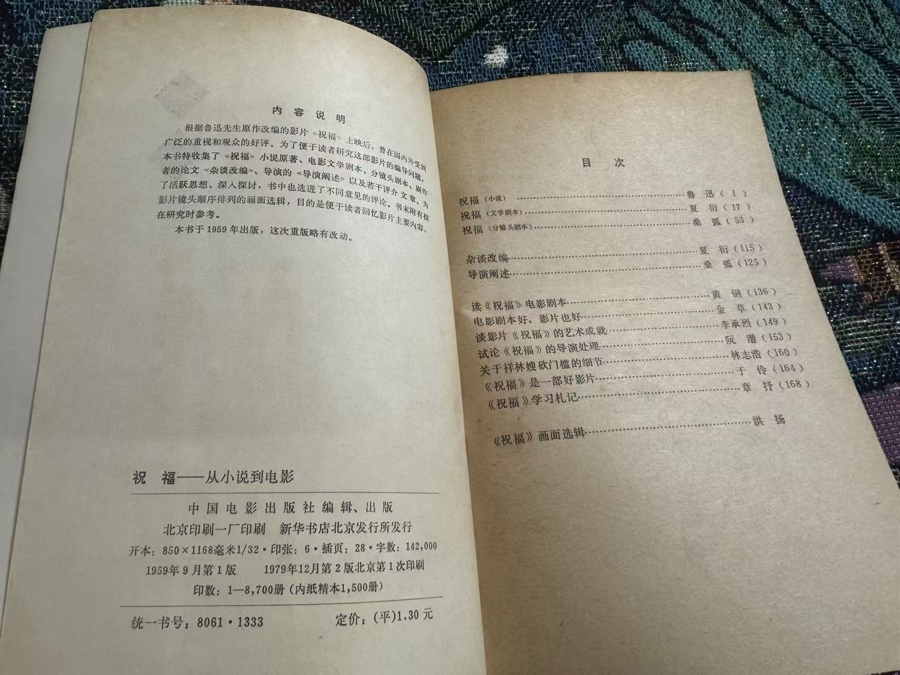 “1959年首次印刷,这本是1979年第二版,当时定价1.3元,花了8元拿下。”这本泛黄的小书收录了根据鲁迅名篇《祝福》改编的同名电影剧本、剧照等,“从母本到电影文学剧本、分镜头剧本、剧作者论文,如今重温加深了对这部经典的理解。”鹿远鲸说,互联网曾流行类似于“你怎么这么祥林嫂的网络梗”,“但我觉得不能这么随意拿人物角色开玩笑,祥林嫂的悲剧是时代多重复杂原因构成的,她应该受到同情、理解和讨论,而非被肆意嘲弄。”在她看来,有价值的旧书往往能提供更多解读经典的视角,也积淀了人生经验的厚度。