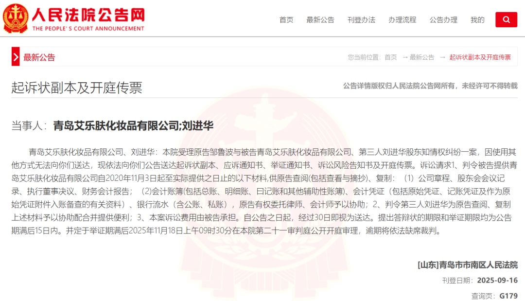 需要注意的是,去年,青岛艾乐肤与韩国艾乐肤均将对方告上法庭,而近日公告开庭的官司只是相关诉讼中的冰山一角。