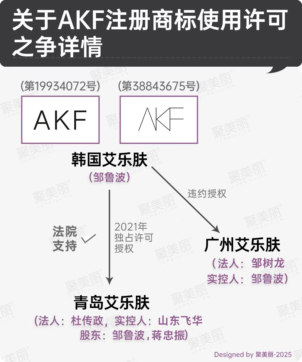 据此前的判决书显示,2021年11月25日,由邹鲁波担任法人、股东的韩国艾乐肤与青岛艾乐肤签订《商标使用许可合同》,该合同中明确约定韩国艾乐肤以独占许可的方式授权青岛艾乐肤使用第19934072号及第38843675号注册商标,并授权其维权的权利,合同带有双方公章,经国家知识产权局公告备案后已产生公信效力。因此,青岛艾乐肤系由邹鲁波与山东飞华合资运营,由韩国艾乐肤提供独占许可授权,在中国市场生产、销售和推广AKF品牌化妆品。