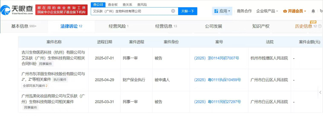 另外,在天眼查上可以看到广州艾乐肤已涉多起司法诉讼,案由包括合同纠纷与商标权纠纷等。其中广州艾乐肤的代工厂,也因合同纠纷将其告上法庭。