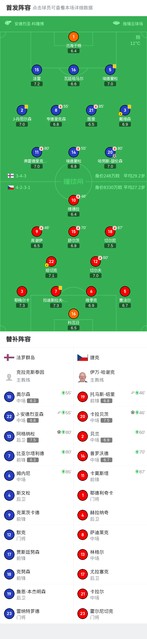 第67分钟,法罗群岛球员J-安德烈亚森助攻哈努斯-瑟伦森打入一球。