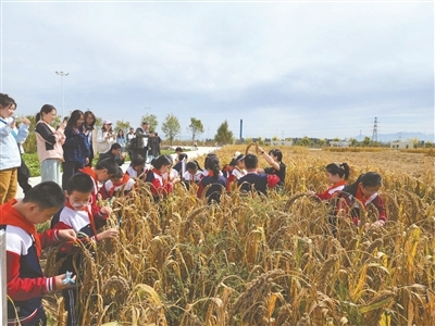 巡天尚谷园研学基地内,学生们在农田里了解稻谷的相关知识