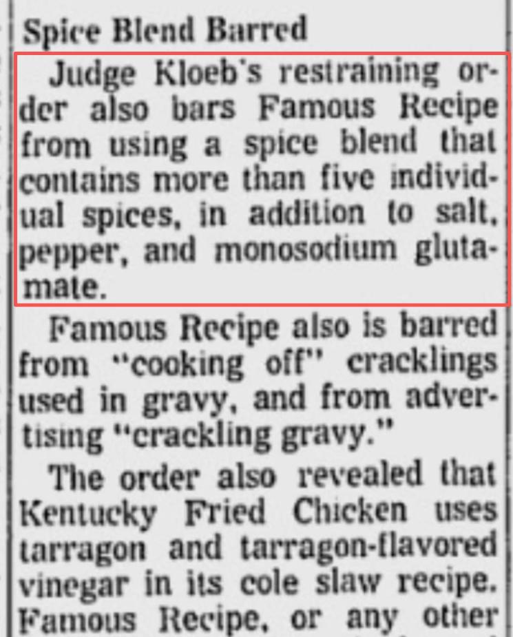 根据多份报道,哈兰德·桑德斯生前曾要求美国印地安纳州马里恩·凯香料公司(Marion-Kay Spices)的比尔·萨默斯(Bill Summers)重新调配他的11种药草和香料混合物。