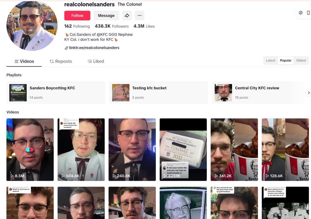 作为侄子的莱丁顿被禁言后,今年8月,桑德斯上校的曾曾曾侄子又出现了,在他的Tiktok账号“Realcolonesanders”(真正的桑德斯上校)中,选择公开了真正的家族秘方。
