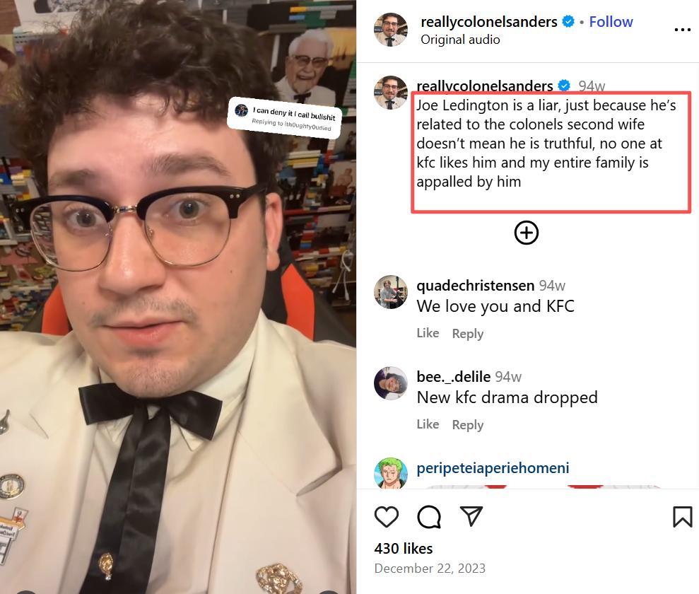 这位侄子早在2022年就创建了自己的社交账号,穿着上校经典白色西装与丝带领带,不是为了恰祖宗烂钱,而是为了“弘扬桑德斯上校的遗产和肯德基的历史”,其中的核心奥义就是拷打现在的肯德基。