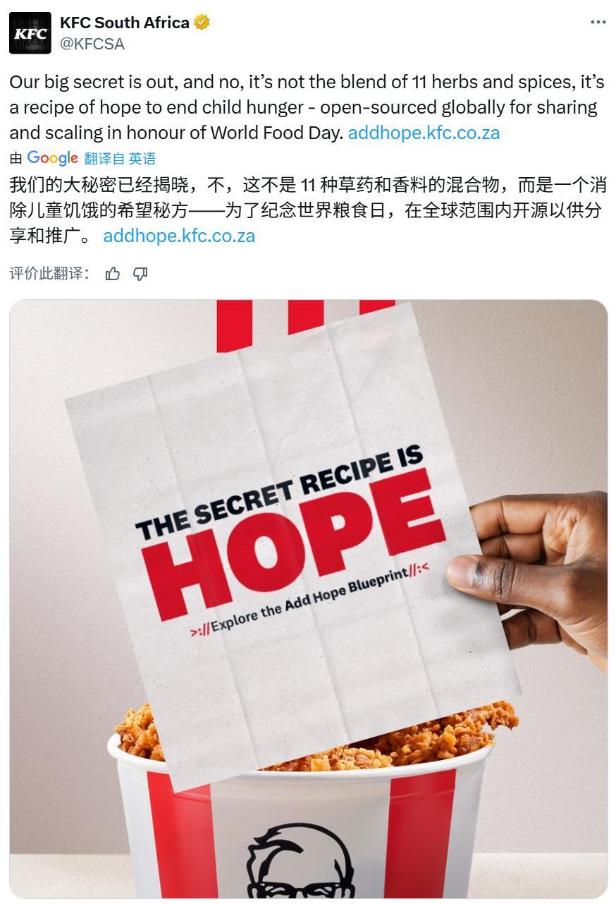 KFC否决了真正的香料配方(杀人诛心),选择公开名为HOPE(希望)的宝贵秘方,还不忘用纪念世界粮食日来当护身符,KFC高层笑了,网友们气笑了......