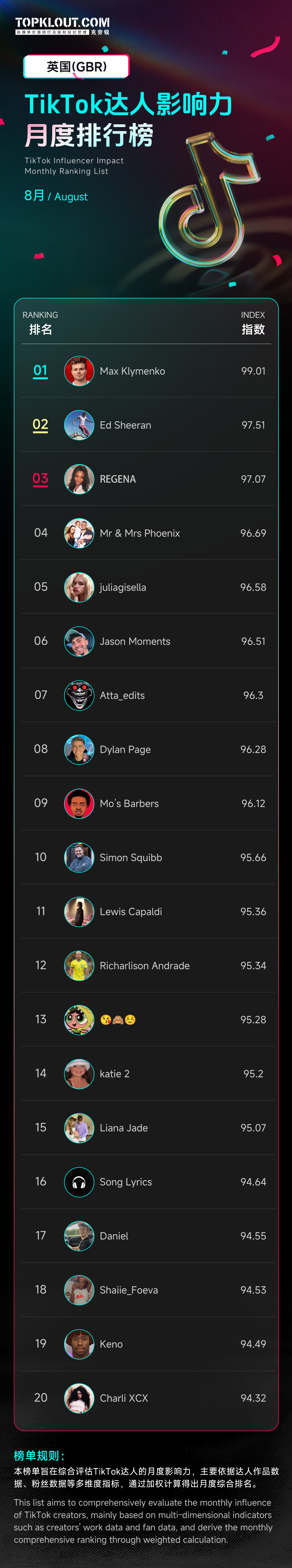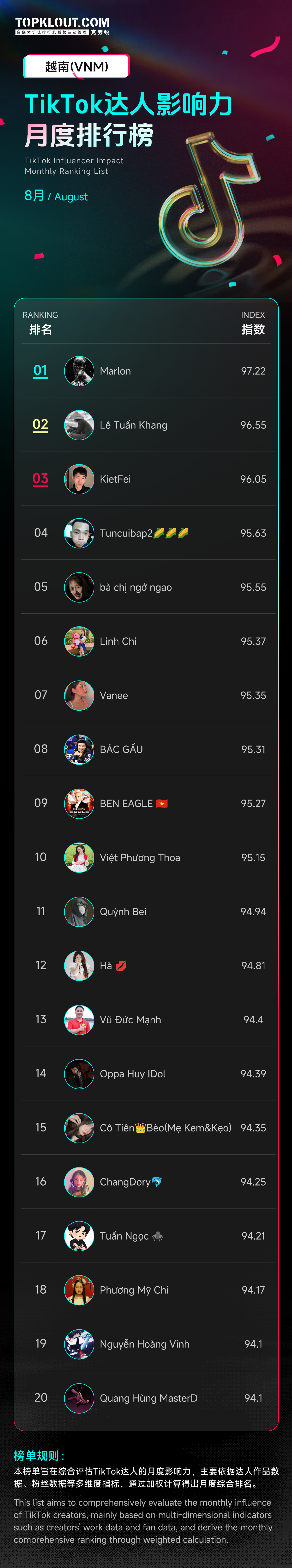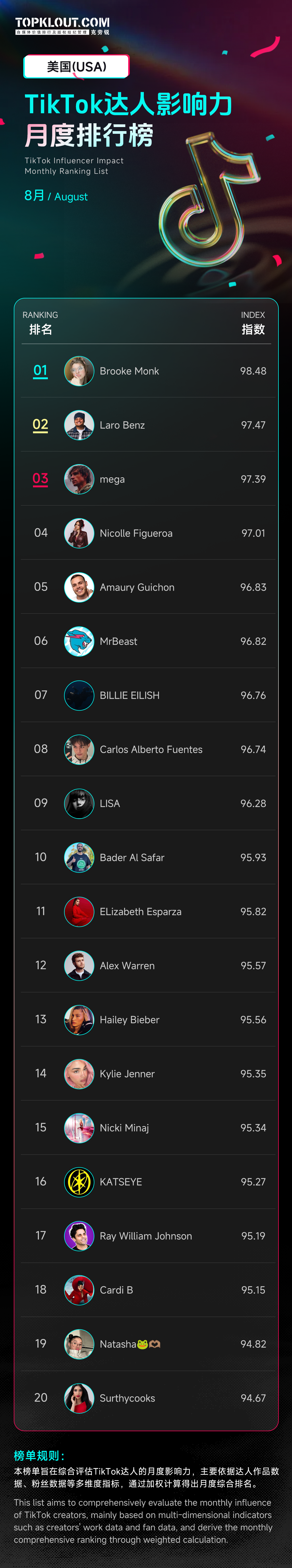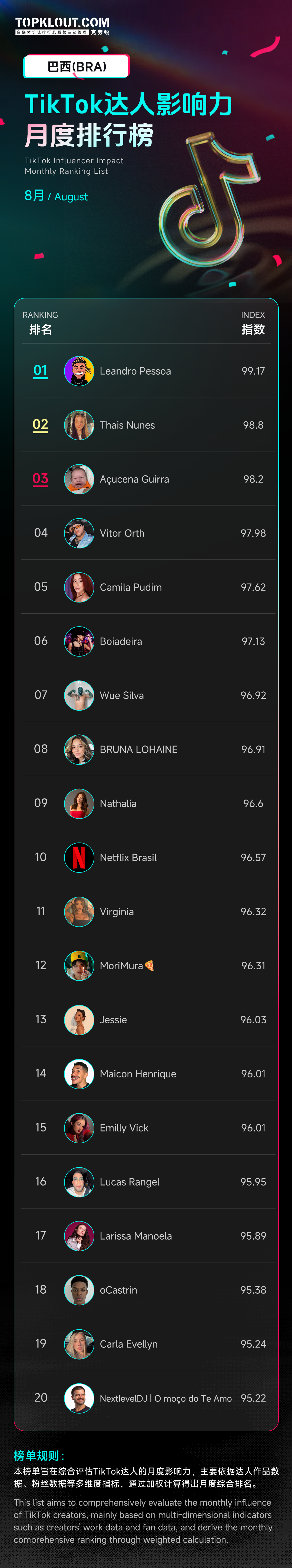 该榜单主要依据达人作品、粉丝数据等多维度指标,通过加权计算得出月度综合排名,评估美国、英国、日本、巴西、泰国、越南等十个国家TikTok达人的月度影响力。