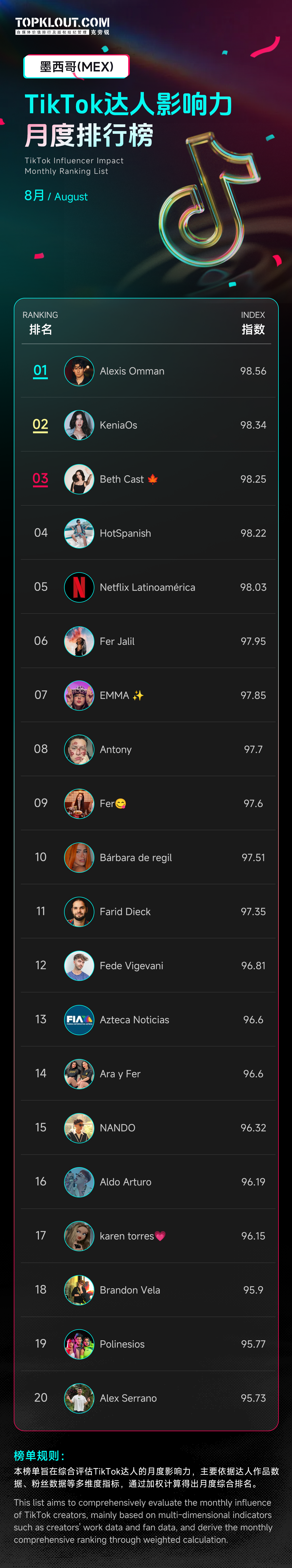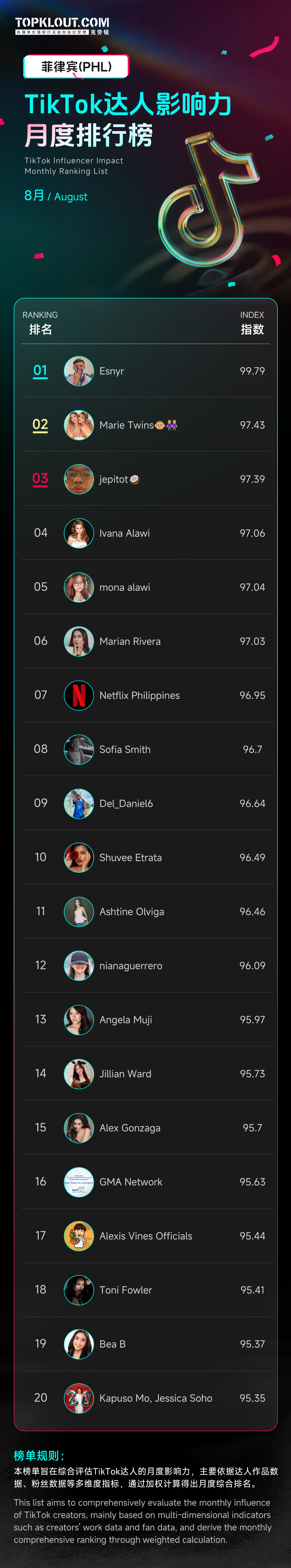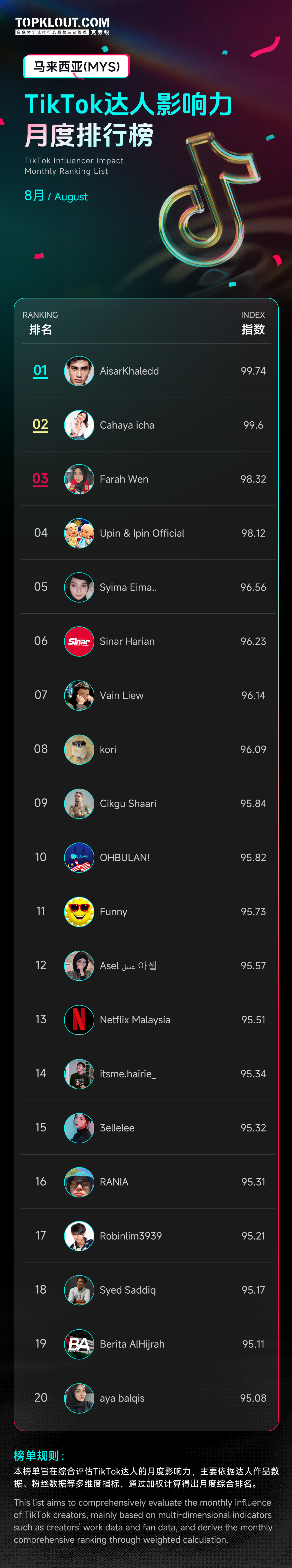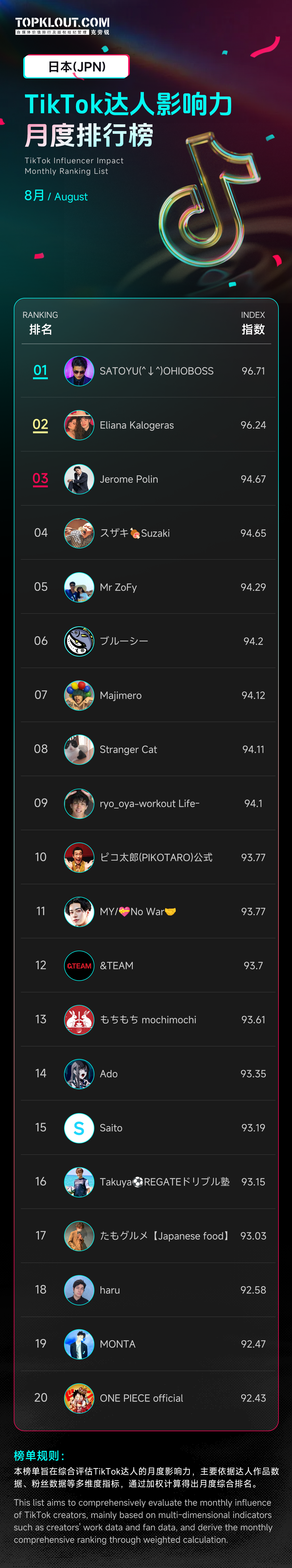 该榜单主要依据达人作品、粉丝数据等多维度指标,通过加权计算得出月度综合排名,评估美国、英国、日本、巴西、泰国、越南等十个国家TikTok达人的月度影响力。