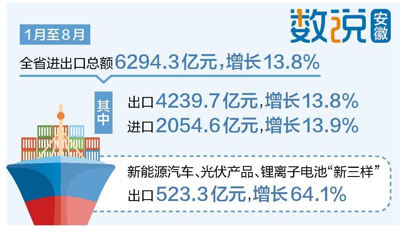 “十四五”期间,我省外贸进出口由2020年的5406.4亿元增长至2024年的8648.5亿元,跨越3个千亿台阶,年均增长12.5%。面对外部局势的不稳定、不确定,我省始终保持强大的发展韧性,坚持高质量供给适配全球市场需求。顺应全球制造业加速转型升级的浪潮,加速推进制造业技术改造与创新,通过高质量供给满足国际市场对高技术、高附加值产品需求。1月至8月,全省规模以上制造业增加值同比增长10.6%,其中计算机、通信和其他电子设备制造业同比增长33.5%。新能源汽车、光伏产品、锂离子电池“新三样”出口保持强劲增长,前8个月出口523.3亿元、增长64.1%,阳光电源公司的光伏逆变器、埃夫特公司的工业机器人等安徽制造明星产品备受海外客户青睐。