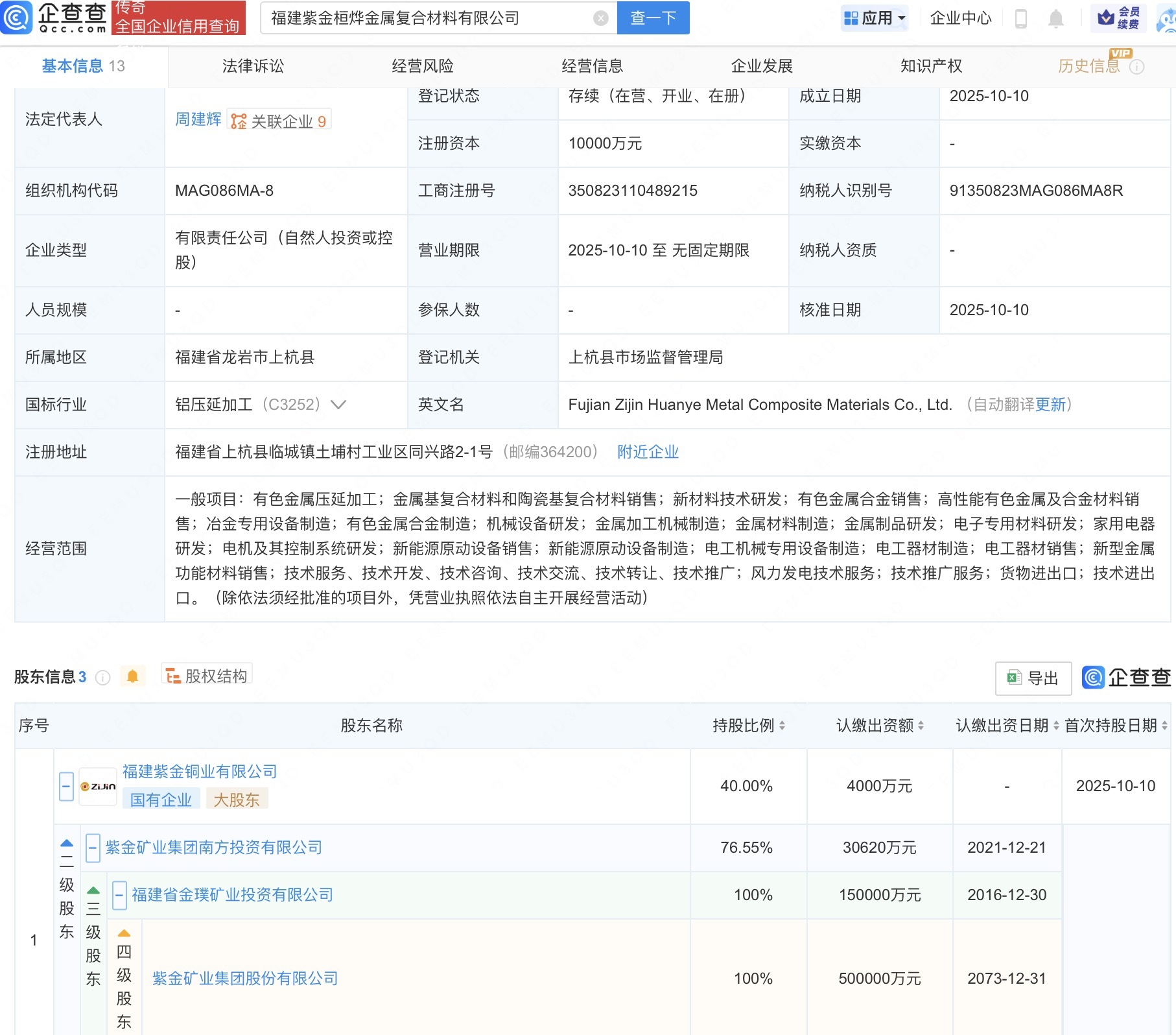 企查查APP显示,近日,福建紫金桓烨金属复合材料有限公司成立,法定代表人为周建辉,注册资本1亿人民币,经营范围包括有色金属压延加工、金属基复合材料和陶瓷基复合材料销售、新材料技术研发等。企查查股权穿透显示,该公司由紫金矿业(601899)旗下福建紫金铜业有限公司等共同持股。