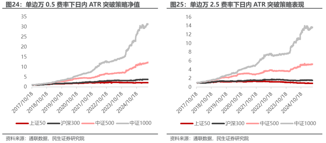日内ATR突破策略对于交易费率较为敏感。策略平均每天开仓1.5次,在单边万0.5的费率下上证50、沪深300、中证500、中证1000都长期能够积累正收益,但在单边万2.5的费率下仅沪深300、中证500、中证1000能够保持长期积累正收益。以单边万2.5的费率进行回测,沪深300、中证500、中证1000的年化收益率分别为:5.8%、24.85%、41.76%,最大回撤分别为-19.27%、-10.18%、-8.07%,夏普比率分别为:0.61、2.01、2.80。