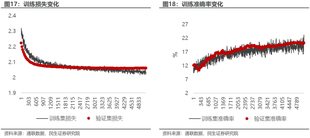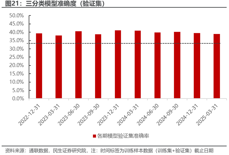 我们以2017年11月1日-2021年12月9日为训练集,以2021年12月10日-2022年12月30日为验证集进行训练。最终验证集的准确率可以由随机的12.5%左右提升至20.35%,虽然没有特别高但提升效果显著。对于样本外2023年-2025年准确率整体在16.14%。