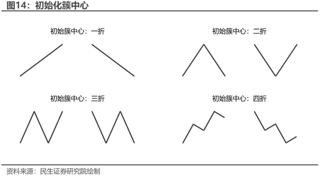 同时为了更好的学到我们想要的类型,对于簇中心的初始值我们直接显式给定。原始算法中簇中心的初始化主要以0值点或随机样本点为主,这样聚类的结果有一定随机性并且可能与我们想要的类型顺序不符。因此我们直接显式的给定簇中心的初始值,主要为一折、二折、三折、四折的共8种基本形态。