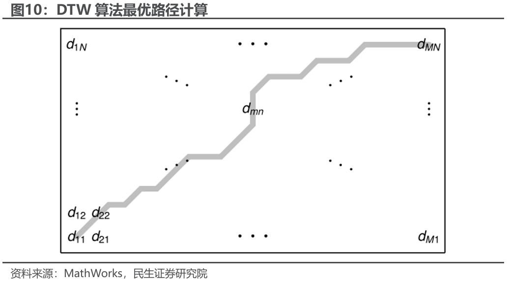 动态时间规划(DTW,Dynamic Time Warping)算法是一种用于衡量两个时间序列相似性的算法。其尤其适用于处理不同长度或速度的序列数据,比如快慢语速下的语音识别。其基本概念是通过动态规划方法寻找一条最优路径,使得两个序列在时间轴上进行非线性对齐(类似于用一个序列沿着另一个序列弹性包边),以最小化累积距离作为相似性度量。DTW距离度量可以克服时间序列在局部的平移不变性、缩放不变性、周期不变性。