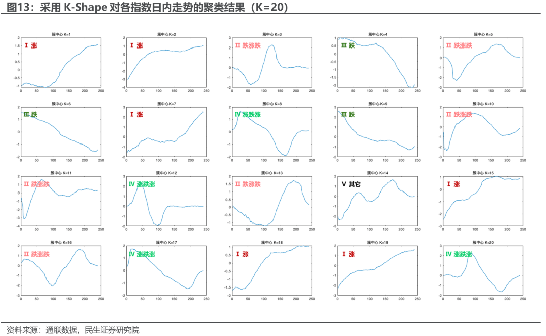 从聚类结果来看20类在形态上有较多重复类型,核心走势基本就四类:涨、跌、跌涨跌、涨跌涨。日内走势走出二折的概率较低,未形成有效的聚类。重复类型更多的是在每一波走势的速度、斜率、停止等特征上有细微的区别,在交易策略的实施上并无太大的区别。因此综合考虑我们首先选择K=8。