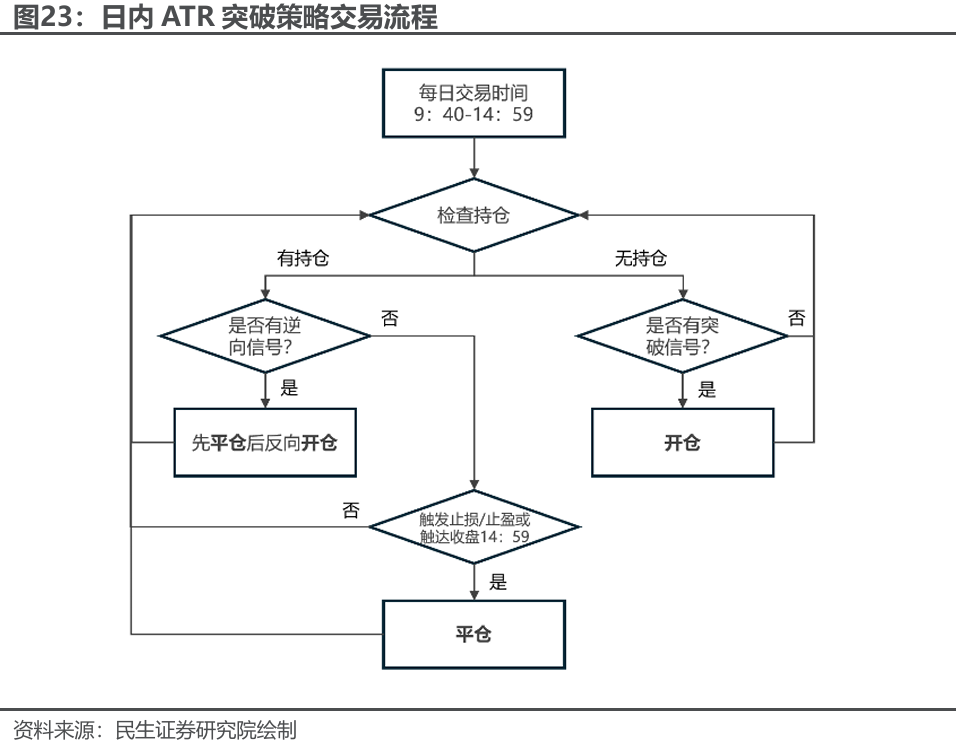 基于深度学习的走势类型预测能够提高一定的判断胜率但仍不足以直接做出买卖决策,因此基线交易策略非常关键。本篇报告中我们以日内ATR突破策略为T0基线策略,进行初步的回测。此策略为趋势策略,其主要以前一日ATR(平均真实波幅)的一定比例k构建交易区间,在价格突破交易区间时进行开仓并动态止盈止损,持仓在接近收盘时间(14:59)必须强平不隔夜。具体方法如下: