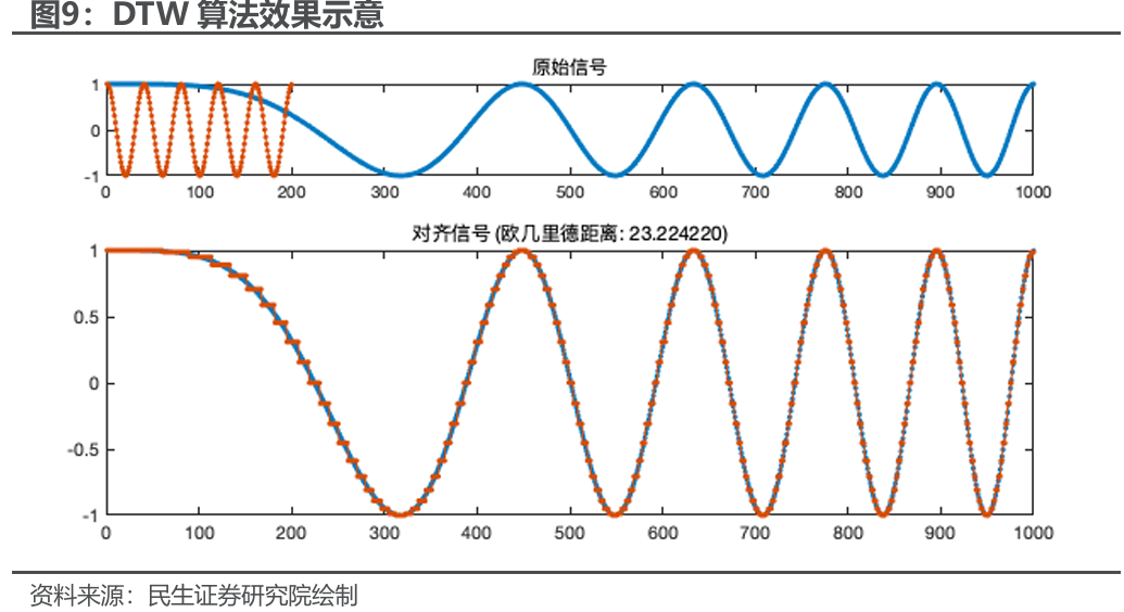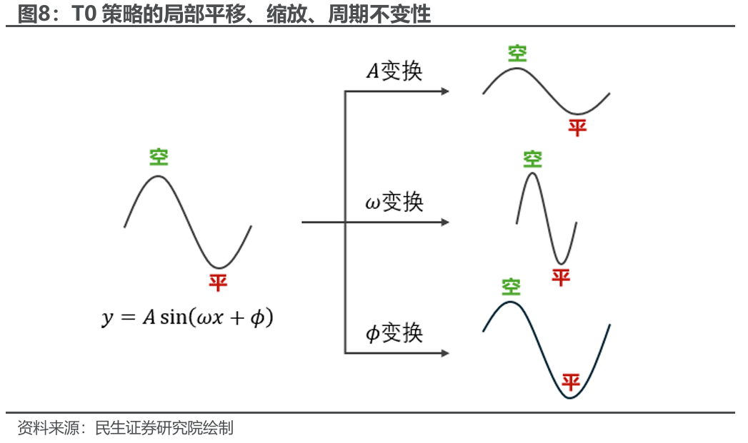 股指的日内走势模式预测是一个分类问题,首先要解决的是到底有哪些类别。这涉及到对每日的走势归纳典型特征,本质是金融时间序列的聚类问题。传统的聚类问题都需要首先计算样本点之间的欧式距离,但这并不适合金融时间序列的走势模式预测。对于走势模式的预测,相似性刻画需要尽量克服局部的:1、平移不变性;2、缩放不变性;3、周期不变性。也就是说能够通过局部平移、缩放、周期变换匹配的都应算是同一类模式,因为对于基于规则的T0策略来说只需特征信息判断日内是否会出现更高价(更低价)也即波形特征即可,无需知道出现的精确时间、幅度、速度。这类似于三角函数中初相位、振幅、角频率的局部变化,不改变波动的路径特征: