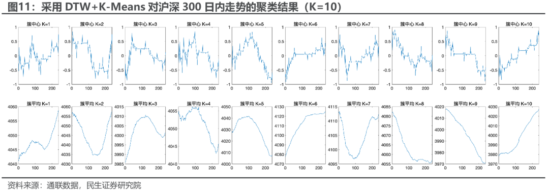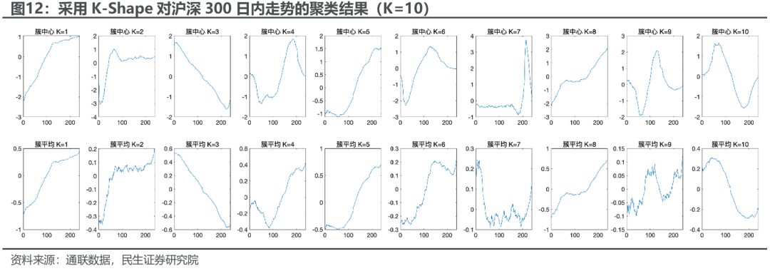 我们采用DTW+K-Means方法对沪深300历史日内1min走势进行聚类,可以看到此算法的簇中心计算极易受到异常值的影响,从聚类效果来看重复形态较多,且DTW整体计算复杂度较高:。