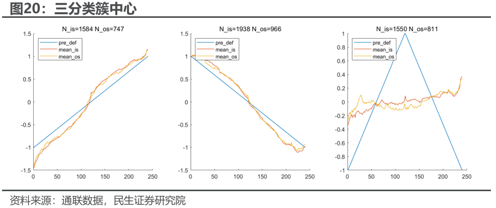 为了针对不同的指数日内路径实施对应的交易策略,首先必须解决日内走势形态的分类问题,我们需要采用能够克服平移、缩放、周期不变性的时间序列聚类算法。DTW+K-Means以及K-Shape就是两类满足类似条件的算法,其中后者效果更好且算法复杂度更低。因此我们采用预定义簇中心的K-Shape算法对股指日内1min时序进行三分类聚类,其在样本内外具有较强稳定性。
