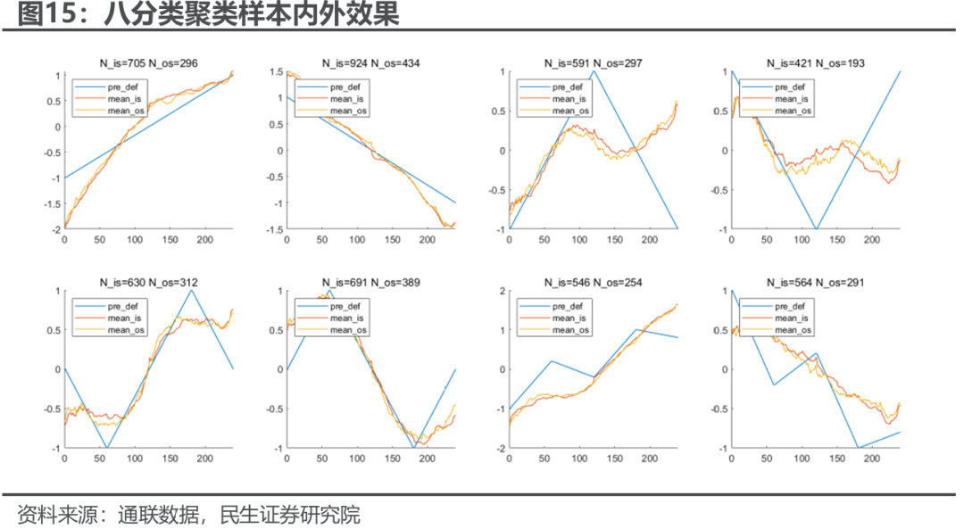 由此聚类得到的簇中心类型与我们设定的顺序基本一致。算法在样本内外的簇中心基本一致,反映出聚类的稳定性。值得注意的是二折的走势在算法迭代下呈现为三折,说明“深V”或“倒深V”的走势实际出现可能较少,另外四折这类复杂走势也并不是一种典型走势类型。关于聚类的数量问题我们将在后文进一步讨论,我们暂且以此八分类作为后续的预测标签。