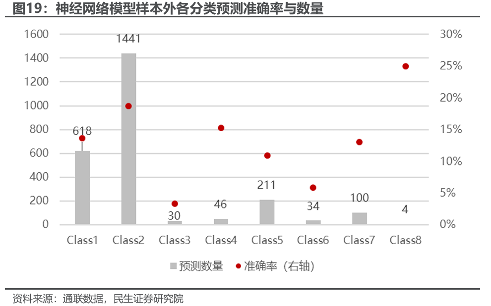 从样本外各分类预测数量来看,八分类下各类别数量差异较大,基本被分到一直涨(Class1)和一直跌(Class2)两类,意味着目前输入的判断信息仅能粗略区分趋势强弱,并不能对盘中具体的路径进行预判(盘中路径或更受盘中信息影响)。因此我们认为在目前的输入特征下实际走势形态的分类可以进一步简化。