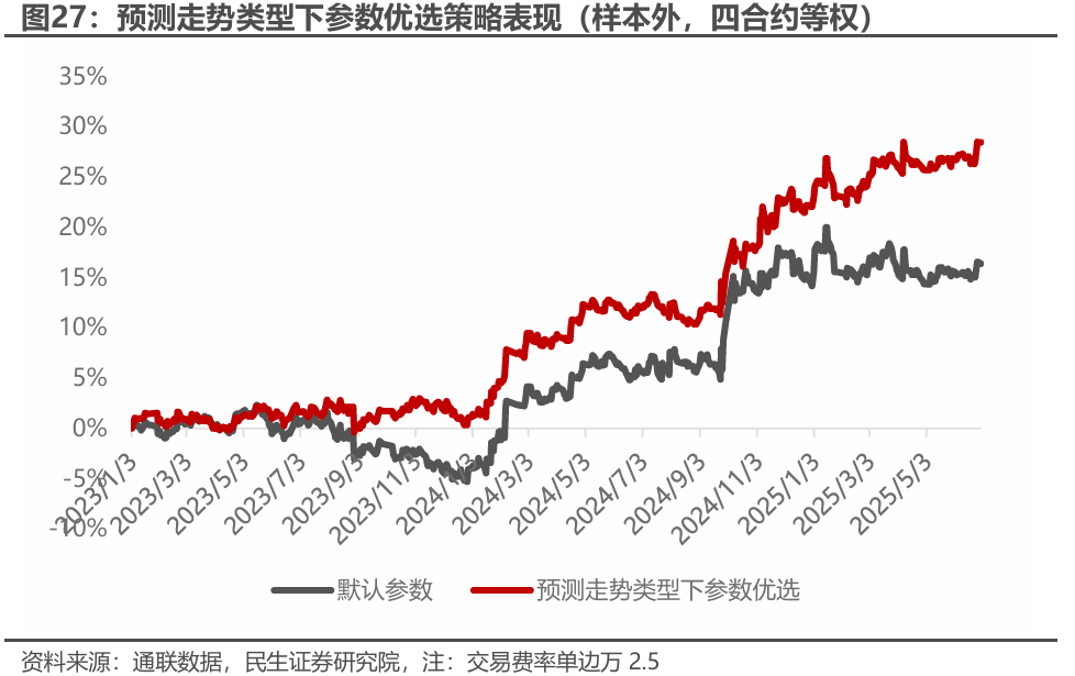 我们取上证50、沪深300、中证500、中证1000的主力合约作为标的进行回测,在样本外(2023年1月-2025年6月)根据季度训练的走势分类预测模型进行交易。四个合约等权配置下,对比不做预测(默认参数)和做预测(参数优选)策略收益由年化6.65%提升至11.19%,最大回撤由7.45%降低至3.62%。