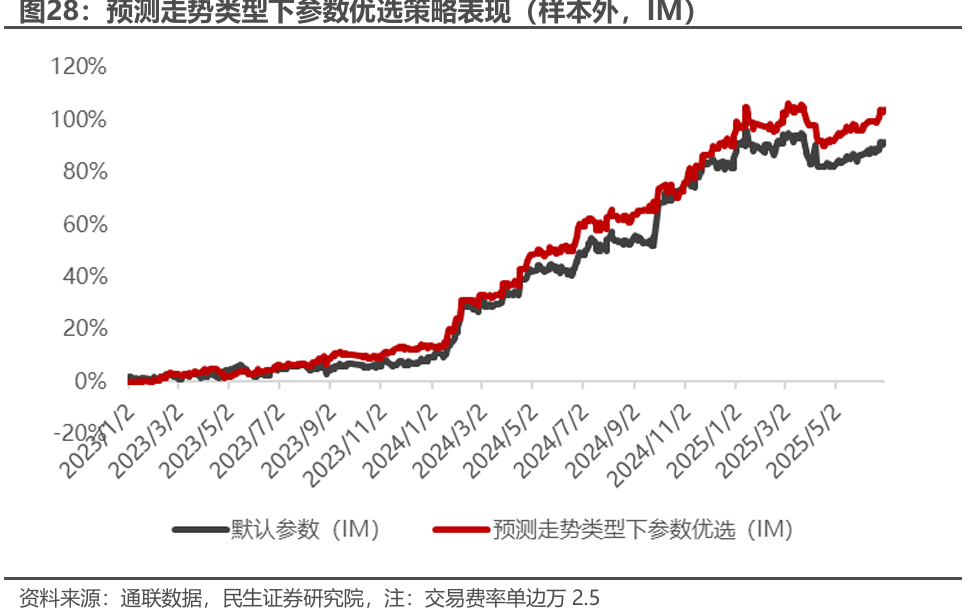 日内ATR突破策略是经典的趋势策略,其利用波动率聚集效应,以近期波动幅度设置开仓、止盈、止损阈值,从而更好的贴合日内收益的分步特征,保持赔率上的微弱优势,从而长期获取稳健收益。但其仅适合趋势市场,不适合震荡市场。结合日内走势类型的预测,通过样本内三类走势标签下的最优寻参,我们可以设计最佳策略参数调用规则,从而增强日内CTA基策略的表现。在四个主力合约等权设置下样本外2023年1月-2025年6月可获得费后年化11.19%的收益和3.62%的最大回撤,如果仅在IM主力合约上实施,年化收益可增加至30%以上,具备较强的潜力。