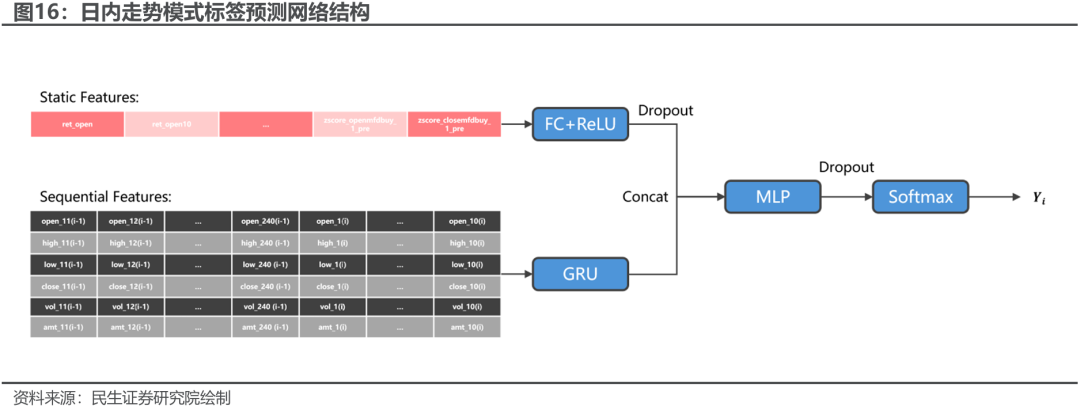 日内走势模式的预测是一个分类问题,我们考虑采用以Softmax函数为输出层的简单MLP(多层感知机)神经网络来处理特征。通用逼近定理(Universal Approximation Theorem)告诉我们一个前馈神经网络,只要包含至少一个隐藏层和足够多的神经元,使用非线性激活函数,就可以以任意精度逼近任意连续函数。模型整体输入两类信息:截面量价特征,时序量价特征。输入截面量价特征的目的是给模型一个偏背景的视角,比如今日开盘是怎么走的,过去几日开盘、盘中、收盘是怎么走的,目前是上涨趋势还是下跌趋势等基本信息;输入时序量价特征的目的是给出更多微观的细节,相比低频信息而言微观细节的预测能力往往更强,两者结合信息集更为完全。模型结构上截面信息进行全连接后与时序信息输入的GRU隐藏层进行拼接(Concat)后输入MLP进行特征组合与搜索。